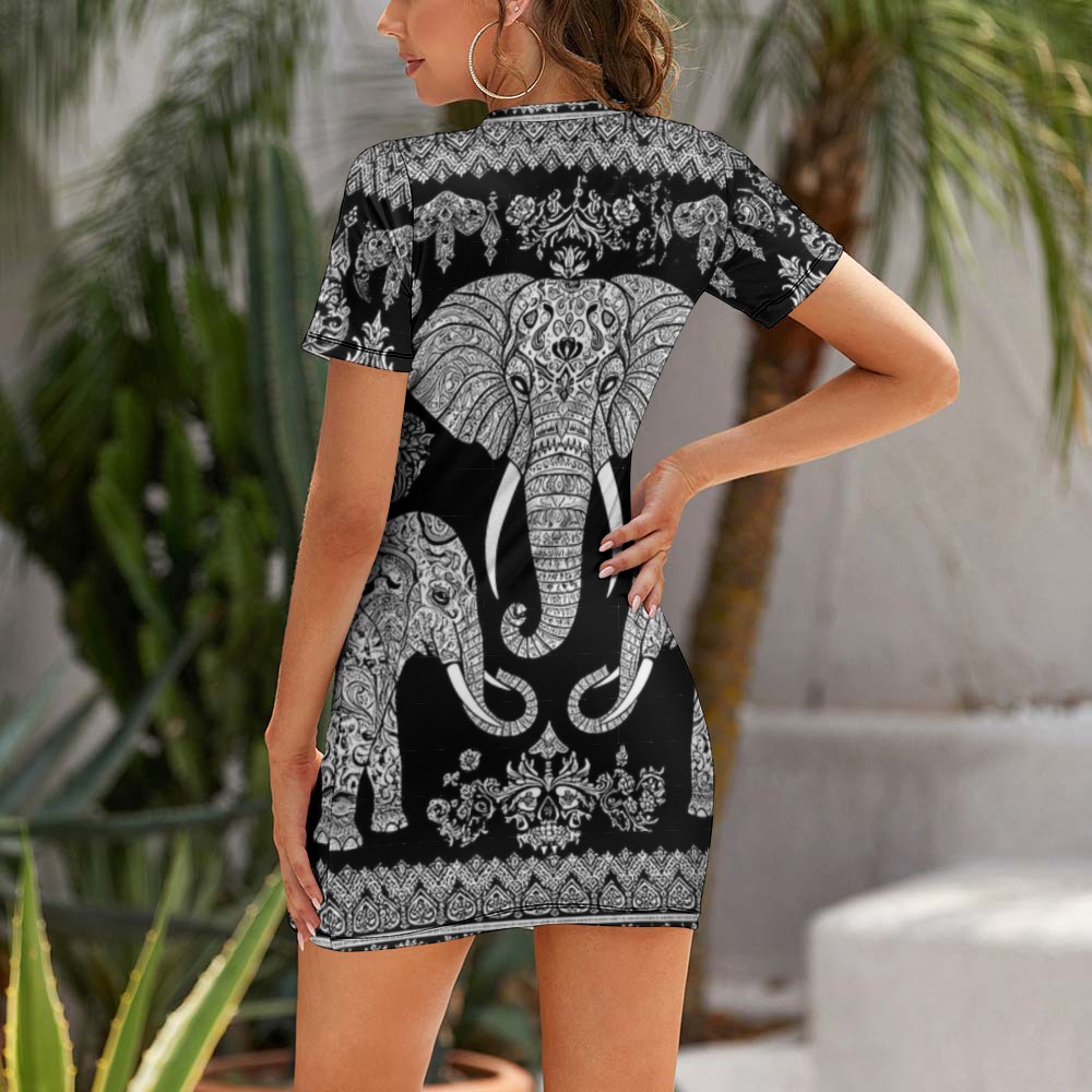 Product Title: Effortlessly Stylish Thai Elephant/Muertos Design Short-Sleeve Dress